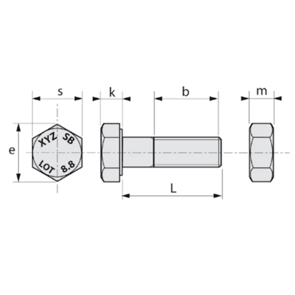 SB = Boulon non-précontraint (dit « ordinaire »), est obligatoirement un ensemble composé d’une vis et d’un écrou, livrés ensemble. La tension de pose n’est pas connue car non nécessaire.